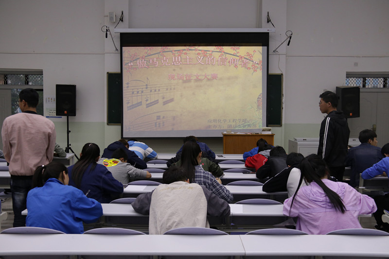 为了进一步检验学习成效,5月23日晚,应化学院团总支新闻部于西阶二教室举行以“做马克思主义的信仰者”为主题的现场写作比赛。参赛人员认真构思文章结构,仔细斟酌用词用句,寄自己真实的所思所想于笔端中,参赛选手们上交了令人满意的答卷。