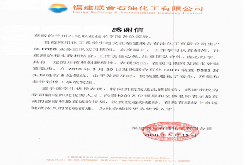 近日,福建联合石油化工有限公司给应化学院发来表扬信。应化学院煤化工生产技术专业154班学生赵文在福建联合石油化工有限公司生产部EOEG业务团队实习期间立足岗位不怕苦、不怕累,虚心好学,工作责任心强,表现尤为突出。3月20日发现联合石化EOEG装置D523封头焊接有8出裂纹,由于及时发现,使装置避免了安全、环保和非计划停工事故发生,受到用人单位的高度肯定。