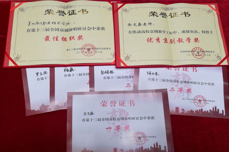 8月21日到26日,由中国戏曲表演学会高校京剧委员会主办,共青团武汉市委员会和武汉理工大学承办的第十三届全国高校京剧演唱研讨会在武汉理工大学举行,全国80余所高校400多名师生参加了比赛和展演,其中有折子戏、彩唱、清唱,总体演唱水平高于往届,反映了国粹京昆艺术在高校喜结硕果。我校盛蕾京剧社学生何小东、杨康、彭栋栋、罗文波和京剧社指导老师余文鑫师生5人参加了比赛,获得一个一等奖,三个二等奖,一个三等奖,余文鑫老师获得优秀京剧教学奖,学校获得优秀组织奖的好成绩。
