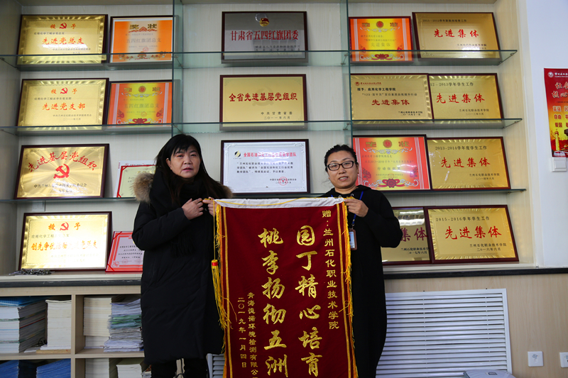 2019年1月4日,青海德诺环境检测有限公司总经理林娜女士与我校16级学生马亚鹏等一行三人专程来到兰州石化职业技术学院,为应用化学工程学院赠送锦旗一副: “园丁精心培育,桃李扬彻五洲”,并特意写来感谢信。应用化学工程学院院长侯侠代表学院接受了公司赠送的锦旗,并对德诺公司的此次赠旗表达了感谢。