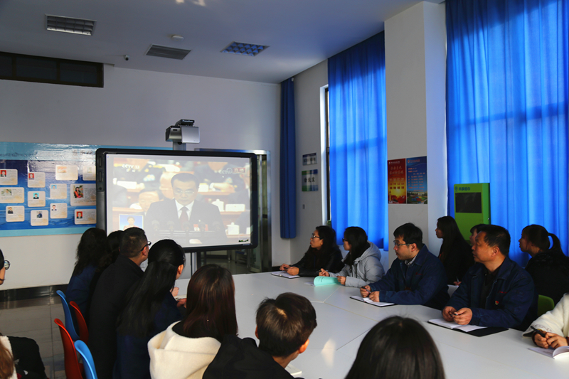 在第四工业中心二楼会议室、办公室、多媒体教室、学生宿舍等场所,院领导、教师和学生们早早就守候在电视、网络屏幕前,收看大会直播盛况。上午9时许,随着大会拉开帷幕,大家专心专注、聚精会神倾听国务院总理李克强所作的政府工作报告,时而埋头记录,时而热烈鼓掌。通过收听收看大会盛况,师生一致表示:对祖国五年来取得的辉煌成就倍感振奋,对教育事业的未来前景充满期待,对祖国经济社会发展充满信心;坚决拥护和贯彻中央的决策部署,将继续勤奋学习、努力工作,不断提升自己的知识水平、专业能力和综合素质,把智慧和力量凝聚到学校“示范校”建设上来,凝聚到促进学校发展上来,为新时代中国特色社会主义事业贡献自己的力量。
