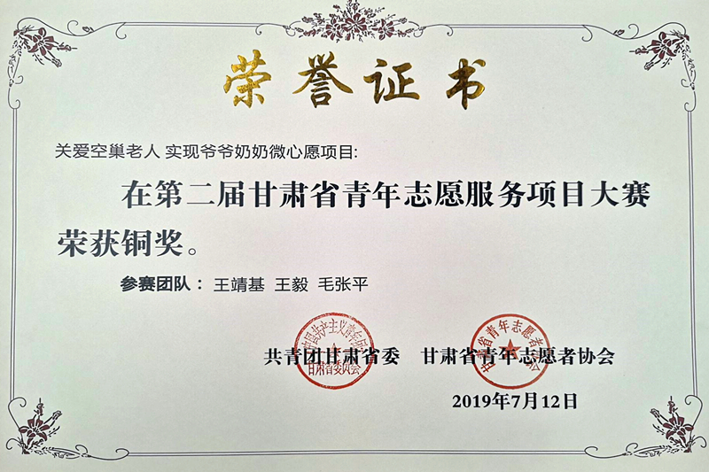 7月12日上午,由共青团甘肃省委和甘肃省青年志愿者协会共同举办的甘肃省第二届青年志愿服务项目大赛暨青年志愿者助力脱贫攻坚论坛在兰州大学落下帷幕。我院红帆志愿者协会申报的项目《关爱空巢老人,实现爷爷奶奶微心愿》荣获铜奖。