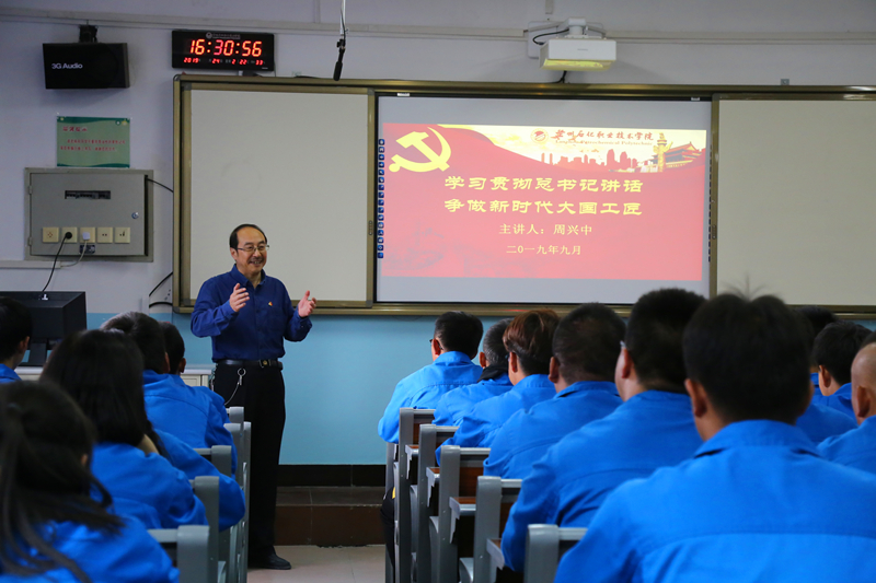周兴中首先详细讲解了党的十八大以来,习近平总书记发表的重要讲话,围绕习近平总书记提出的许多新思想新观点新论断新要求,解读了新形势下党和国家发展的一系列重大理论和现实问题。随后,周兴中从五四运动讲到中国特色社会主义进入新时代,中华民族迎来了从站起来、富起来到强起来的伟大飞跃。五四运动至今已近百年,这期间社会的进步,民族的富强,人民的幸福,离不开当时抛头颅洒热血的志士,离不开党的英明领导,同时也离不开青年人对核心价值观的践行与传播。每一代青年都有自己的际遇,生逢其时的我们应铭记责任,扬起风帆,以奋斗浇筑青春,为民族复兴铺路架桥,为祖国建设添砖加瓦。周兴中教导同学们作为当代大学生,我们必须严格按照习近平总书记的要求,努力全面提高自身素质,要忠于祖国人民,勤奋踏实、刻苦钻研,立鸿鹄志,做奋斗者,求真求实,知行合一,力争成为一名“有理想信念、有道德情操、有扎实学识、有仁爱之心”的合格学生。作为技术技能型人才,就必须做到“求真学问、练真本领”,把自己的发展和国家的发展联系起来,为争做新时代大国工匠而努力奋斗。