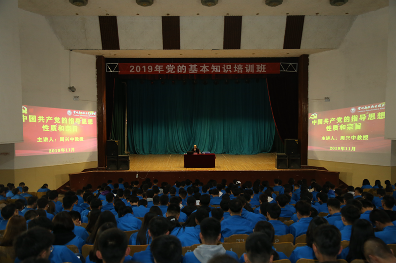 周兴中用生动的语言以“党是亲爱的妈妈”“共产党像太阳”“中国共产党是事业领导核心力量”三组关键词为切入点,从党、共产党及中国共产党三个概念及本质区别开始分析,运用丰富的历史典故,逻辑清晰、旁征博引、深入浅出地讲解中国共产党的产生及发展历程。周兴中围绕中国共产党的发展历程和我国的历史与现实,用通俗的语言和生动的事例,在大的时间和空间跨度中进行纵横比较,阐述了中国共产党的领导地位是历史的选择、人民的选择,没有共产党就没有新中国,只有共产党才能发展中国。随后,他通过对马克思列宁主义、毛泽东思想、邓小平理论、“三个代表”重要思想、科学发展观及习近平新时代中国特色社会主义思想内涵的解读,说明我党的指导思想具有独创性、一脉相承性、与时俱进性等优良性质。同时,他从党的阶级性、先进性、党的地位和作用等方面阐释党的性质,并指出中国共产党是中国工人阶级的群众基础、是中国人民和中华民族的先锋队,他强调:党的最终目标是实现共产主义。同时,他从“为人民服务”思想的历史背景,深入浅出地分析了其本质内涵,阐述了“为人民服务”思想的现实意义,明确了党的宗旨是“全心全意为人民服务”。最后,他对每一位学员给予厚望,希望每位学员要“不忘初心、牢记使命”,并鼓励每位学员要努力学好理论知识和专业技能知识,争取早日加入党组织。
