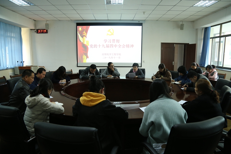 2019年11月13日下午,应用化学工程学院党总支在东主教二楼圆桌会议室专题学习贯彻党的十九届四中全会精神,学院领导班子成员及全体教工党员参加。会议由学院党总支书记吴海霞主持。