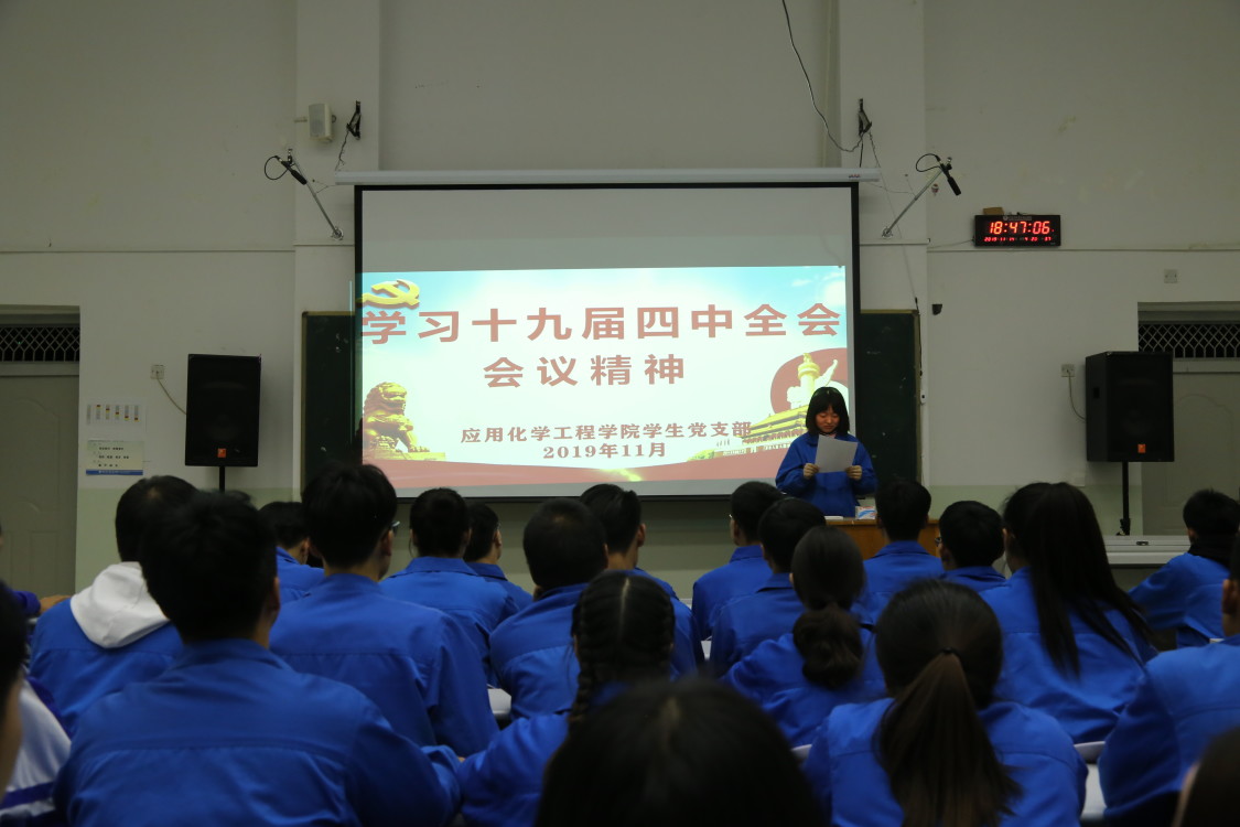11月15日晚,应用化学工程学院学生党支部召开全体党员集中学习会,专题学习中国共产党十九届四中全会精神。支部书记朱杭静主持学习,在校学生党员参加了学习。