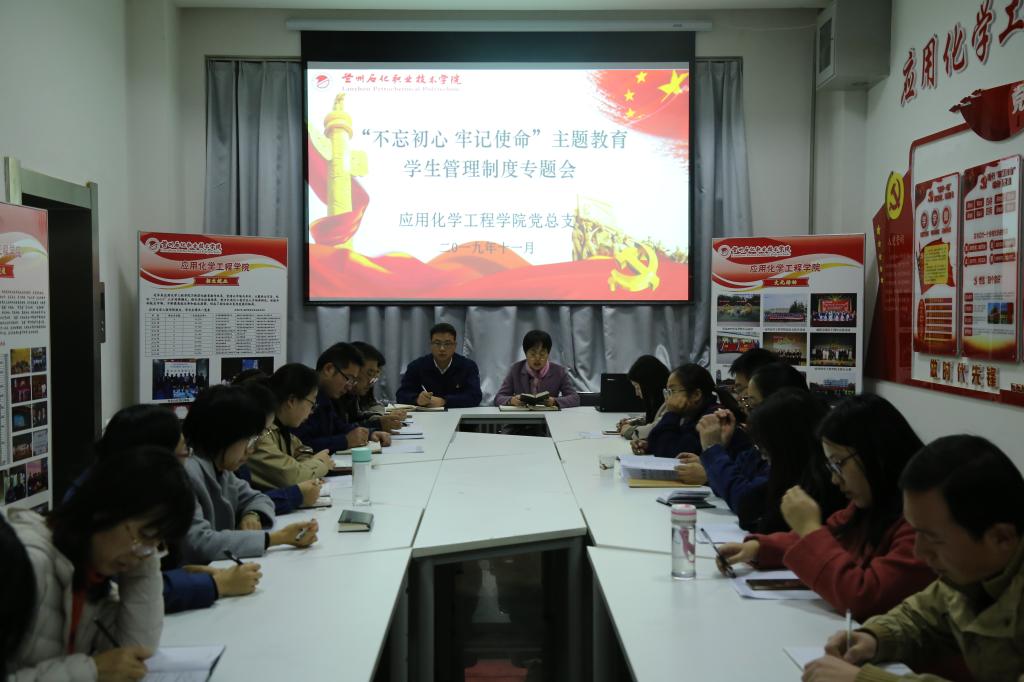 为进一步推进“不忘初心、牢记使命”主题教育,加强我院学生管理工作,促进优良班风、学风建设,增强学生管理工作的针对性、实效性。11月17日晚上,应用化学工程学院在四中心二楼会议室召开“不忘初心、牢记使命”主题教育学生管理制度专题会议,会议由学院党总支书记吴海霞主持,辅导员和全体班主任参加了专题会。