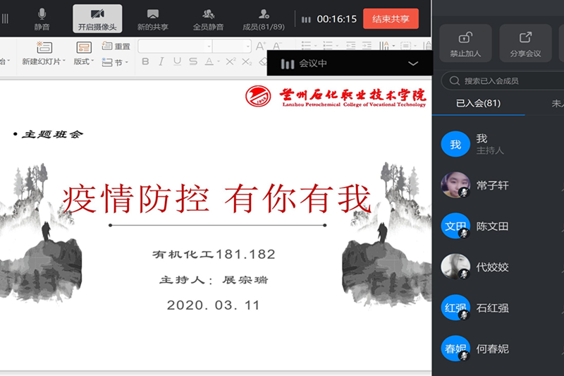 为全面落实学校新学年第一次学生工作例会精神,进一步加强疫情防控期间在家学生的心理疏导和教育服务,3月13、14日,应用化学工程学院各班级召开“疫情防控 有你有我”网络主题班会。