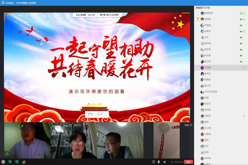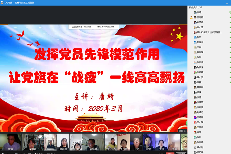 为贯彻落实习近平总书记关于疫情防控的重要指示精神,进一步发挥党员在抗击疫情阻击战中的先锋模范作用。3月26日下午,应化学院教工党支部书记唐靖通过在线视频的形式,以“发挥党员先锋模范作用,让党旗在‘战疫’一线高高飘扬”为主题,给全体教工党员讲授了一堂生动的党课。