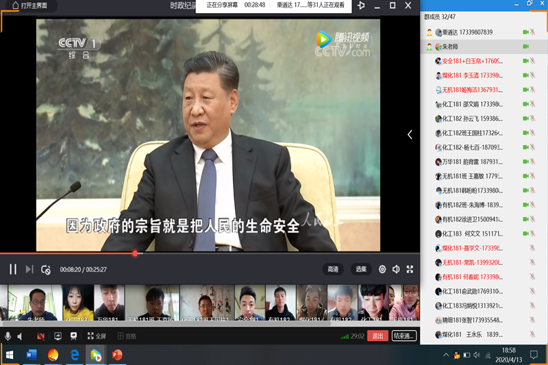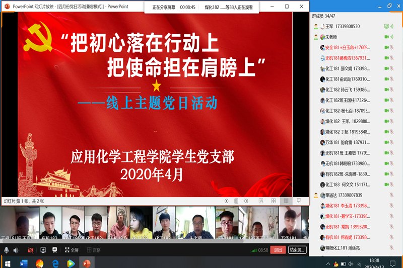 为扎实做好延期开学期间学生党员教育工作,保证学生党员学习不中断不放松,发挥好党支部学习、宣传主阵地的作用,4月13日晚,应用化学工程学院学生党支部充分运用“QQ”平台的“视频会议”功能召开了“把初心落在行动上、把使命担在肩膀上”线上主题党日活动。