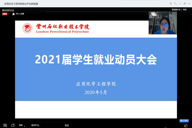 为全面推进2018级学生就业工作,提高就业质量,应用化学工程学院于5月21日晚在钉钉平台中召开了“2021届学生就业动员大会”。学院党总支书记吴海霞、院长助理唐靖,全体辅导员、班主任及18级学生参加了大会。