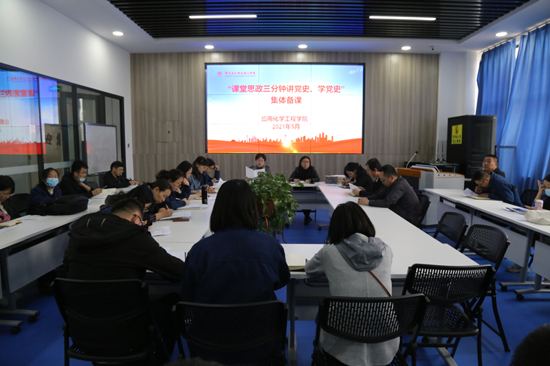 为深入学习贯彻习近平总书记在党史学习教育动员大会上的重要讲话和省委、省教育工委关于党史学习教育的相关通知及学校关于开展“课堂思政三分钟讲党史、学党史”活动通知精神,聚焦立德树人根本任务,将党史教育与思政课和专业课相结合,激励学生用实际行动学党史、悟党史、用党史, 5月6日下午应用化学工程学院在第四工业中心二楼开展“课堂思政三分钟讲党史、学党史”集体备课活动,学院领导、全体教师参加此次备课活动。