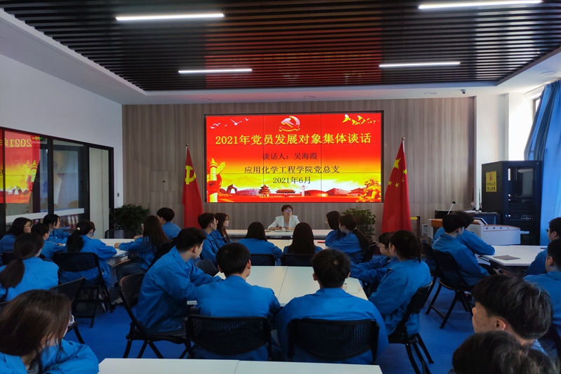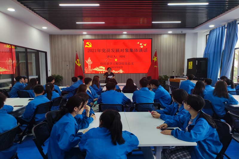 6月15日中午,应用化学工程学院党总支在学院四中心二楼会议室组织进行了2021年学生党员发展对象集体谈心谈话活动,由学院总支书记吴海霞、副书记刘珂分别对100名学生党员发展对象开展了集体谈话。