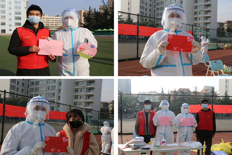 11月4日上午,来自甘肃宝石花医院(兰州石化总医院)的核酸检测医护人员在石化大学西校区完成了第四轮核酸检测,学生们虽然看不清医护人员防护服背后的面孔,但这却让象牙塔中的00后最真切地感受到疫情下的温度。同学们把自己精心制作,亲笔写下的感谢信送给医护人员“我不能帮您们分担什么,甚至怕这封信您们无法看见,只希望您们不要太累,多穿些衣服,注意保暖,才能有力气一同战胜疫魔。”“核酸检测的白衣天使,谢谢您!”等内容。一封信,表达了应化学子的感恩之情,学习医护人员抗击疫情,共克时艰的拼搏精神,无私奉献的家国情怀!一封信,虽然简短,却代表了应化学子最真心的感谢;一封信,尽管平实,却表达了应化学子师生最真挚的祝福。医护人员向同学们说:“看到信中的内容,这些话,给了我们很大的安慰。我们最大的愿望就是希望同学们都能保护好自己,健健康康。”