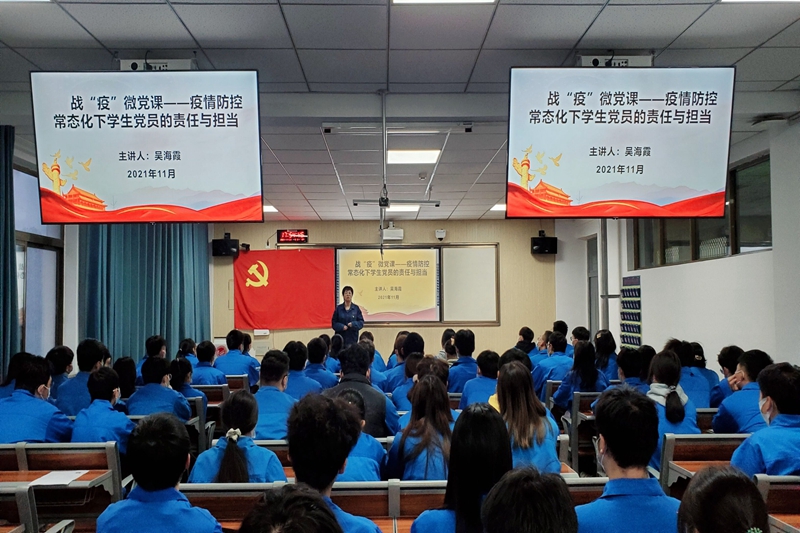 疫情防控是本鲜活的教材,是一个生动的课堂。为了引导学生党员从伟大的抗疫精神中汲取力量,深入挖掘广大师生全员参加校园战“疫”的德育元素,积极开展有针对性的思想政治教育活动,11月29日,应用化学工程学院党总支书记吴海霞在综合楼304教室为学生党员、入党积极分子上了一堂“疫情防控常态化下学生党员的责任与担当”微党课。