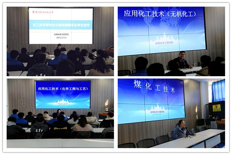 会上,应用化工技术(化学工程与工艺方向)、应用化工技术(有机化工方向)、应用化工技术(无机化工方向)、应用化工技术(公用工程方向)、煤化工技术、精细化工技术六个专业的教研室主任分别对各自专业进行详细而精彩的介绍,内容主要围绕专业设置、专业办学条件、专业发展、专业特色、毕业生就业等方面,内容全面,生动易懂,为学生在大类招生范围内选择自己感兴趣的专业奠定了良好的基础。随后,齐晶晶传达了《兰州石化职业技术学院大类招生专业分流实施办法》文件精神,进行政策解读,并从专业分流原则、分流依据和分流程序三个方面详细介绍了大类招生专业分流工作细则。