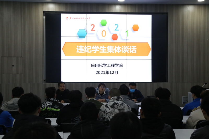 12月21日晚,应用化学工程学院在第四工业中心二楼会议室召开违纪学生帮教集中谈话。学院党总支书记吴海霞,副书记唐靖,辅导员出席会议,2020、2021级的违纪学生参加集体谈心谈话会。