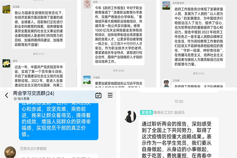 组织开展线上热议两会精神。组织师生就大家关心的热点问题进行线上讨论、交流,大家对“十四五规划”、“乡村振兴”、“就业问题”等热门话题各抒己见,真正把“两会”里出现的热点话题学深、学透。培养同学们关心国家时事热点的意识,努力锻造合格大学生。每名学生党员、入党积极分子结合会议内容畅所欲言,在相互讨论、充分交流中激发思想活力,真正使得“两会”精神入心入脑。
