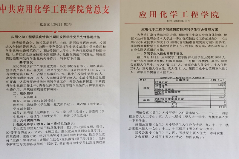 疫情防控实行封闭式管理以来,应用化学工程学院针对特殊时期学生管理工作实际,加强风险研判,织密工作网络,细化工作举措、紧盯重点人群,强化责任落实,突显人文关怀,确保学生的安全稳定和心理健康。织密校园疫情防控网。