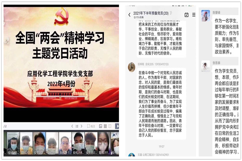为深入学习2022年全国“两会”精神,提高学生党员的政治意识,增强使命担当,4月14日晚,应用化学工程学院学生党支部通过“QQ”平台开展了“学习2022年全国两会精神”线上主题党日活动。