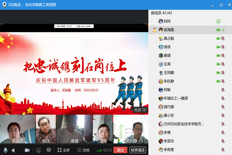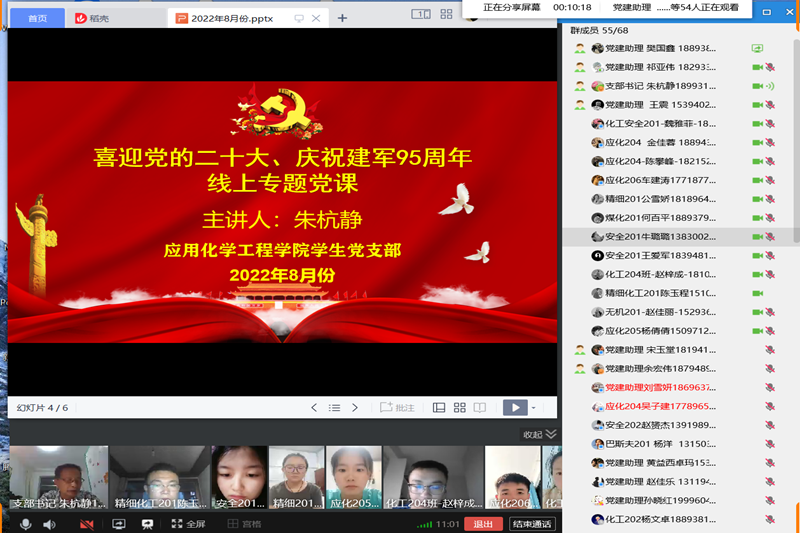 为迎接党的二十大胜利召开,深入推进红色基因传承教育,缅怀人民军队的伟大业绩,教育引导党员干部学党史、知党情、跟党走,全面提升政治理论素养和党性修养,8月1日晚,应用化学工程学院教工党支部和学生党支部分别组织党员通过QQ群,开展了庆祝建军95周年线上专题党课。本次党课分别由党总支书记吴海霞和学生党支部书记朱杭静主讲。