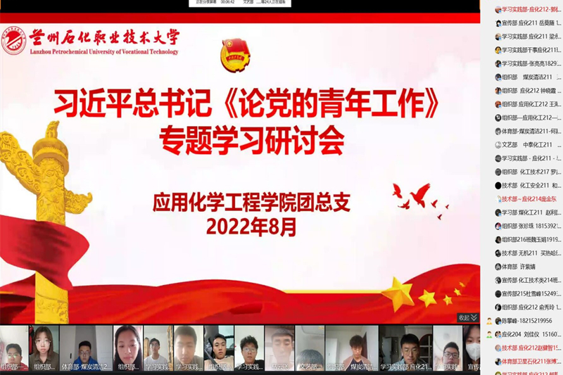 为深入学习贯彻习近平总书记《论党的青年工作》著作内容,8月29日下午,应用化学工程学院团总支组织学院团员青年召开习近平总书记《论党的青年工作》线上专题学习研讨会,学院全体团员参加了此次会议。