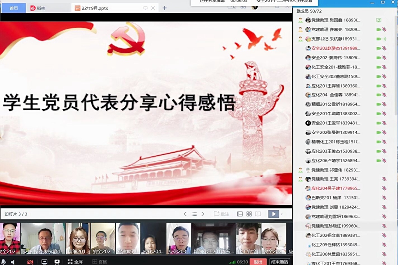 为进一步深化学生党员的使命担当,迎接党的二十大胜利召开,9月11日晚7:30,应用化学工程学院学生党支部利用QQ平台开展“喜迎二十大同心展担当”线上主题党日活动。