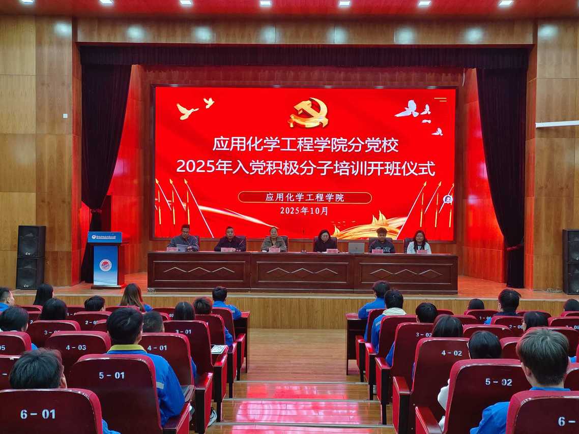 按照学校党校《关于认真做好2025年入党积极分子教育培训的通知》要求,10月10日晚,应用化学工程学院分党校在西区报告厅隆重举行2025年入党积极分子培训班开班仪式,并开展第一次专题授课。学院相关负责人、学生党支部书记以及2023级、2024级共140余名入党积极分子参加仪式。