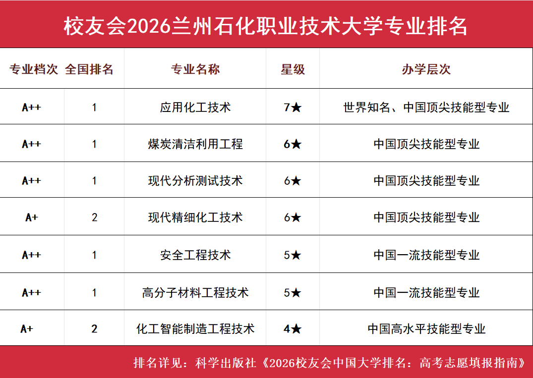 近日,全国第三方大学评价研究机构艾瑞深校友会网(Cuaa.net)正式发布《2026校友会中国大学排名:高考志愿填报指南》,兰州石化职业技术大学在综合实力、专业建设等方面表现亮眼,多项排名跻身全国前列,多个专业获评高星级顶尖专业。
